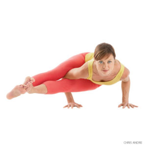 With the right leg supported on the shoulder, exhale and bend your elbows. Lean your torso forward and lower it toward parallel to the floor; at the same time, straighten your knees and extend your legs out to the right, parallel to the floor (and perpendicular to your torso). Squeeze your upper right arm between your thighs. Use that pressure to help twist your torso to the left. Keep your elbows in close to the torso. Look at the floor.