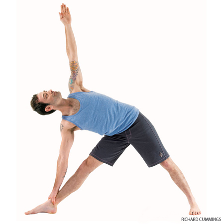 Rest your hands on the back of your pelvis, bases of the palms on the tops of the buttocks, fingers pointing down. Use your hands to spread the back pelvis and lengthen it down through your tail bone. Then lightly firm the tail forward, toward the pubis. Make sure though that your front groins don’t “puff†forward. To prevent this, press your front thighs back, countering the forward action of your tail. Inhale and lift your heart by pressing the shoulder blades against your back ribs.
